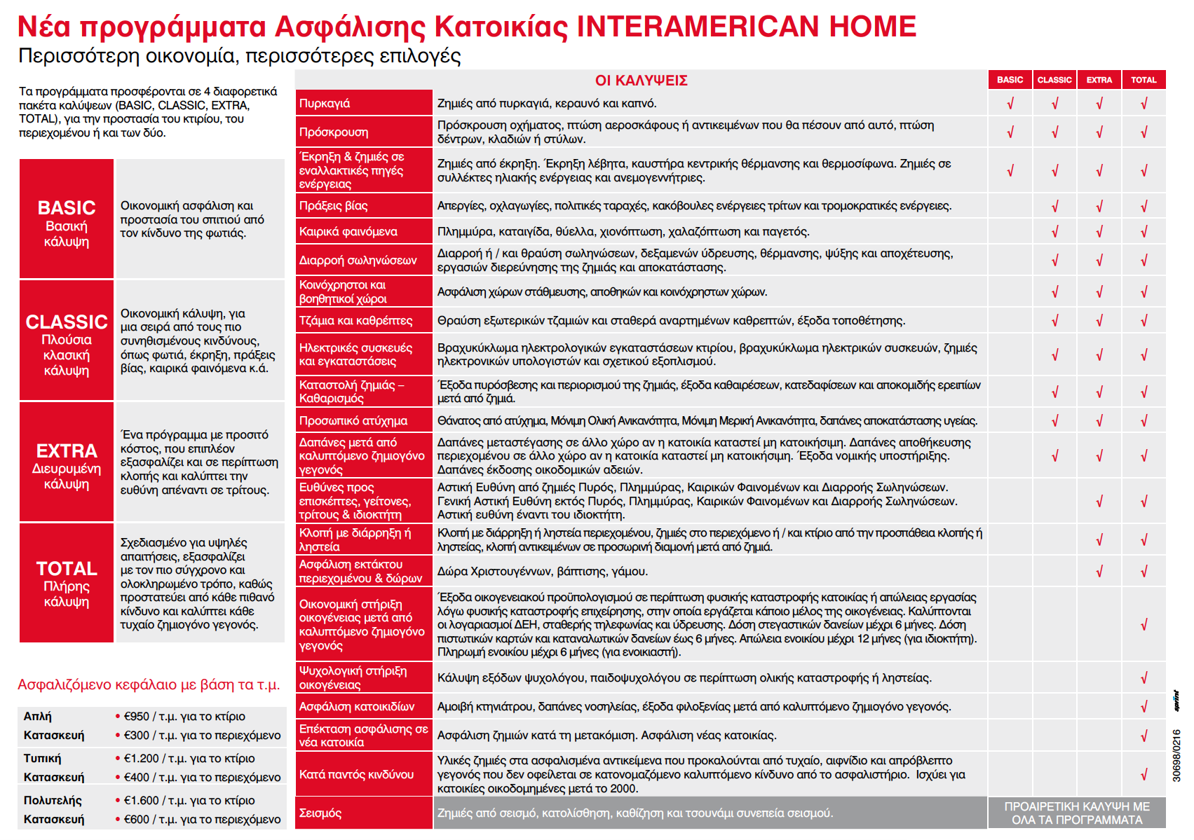 Τα προγράμματα ασφάλισης κατοικίας προσφέρονται σε διαφορετικά πακέτα συστηματοποιημένων καλύψεων (BASIC,CLASSIC, EXTRA, TOTAL), ανάλογα με το βαθμό προστασίας που επιθυμείτε. Κάθε πακέτο προσφέρεται για την κάλυψη του κτιρίου, του περιεχομένου ή και των δύο.